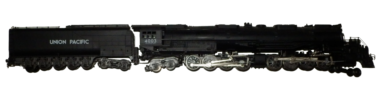 transamerická dvoukotlová lokomotiva BigBoy od Rivarossiho pro dálkovou nákladní dopravu přes Ameriku, epocha III, celkem dobrý odběr elektřiny, dobře jezdila přes výhybky, ale poloměry oblouků jen R3, R4. Délka lokomotivy přes 40cm